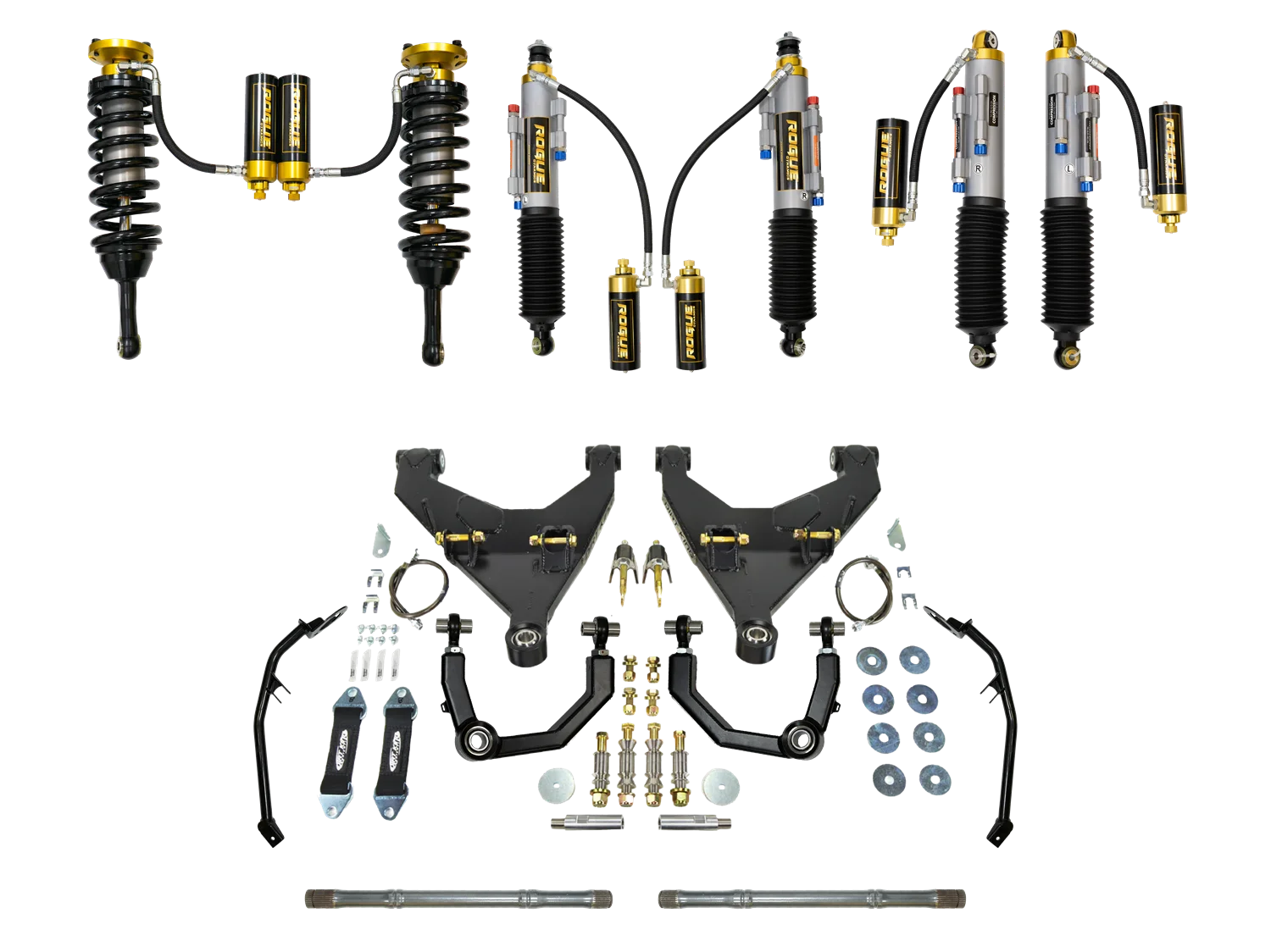 ROGUE DYNAMICS FJ FRONT 3.0 COILOVER SHOCKS WITH REMOTE RESERVOIR AND HI/LO COMPRESSION ADJUSTERS + ROGUE DYNAMICS FJ 2007 TO 2023 3.0 REAR TRIPLE BYPASS SHOCKS WITH REMOTE RESERVOIR AND HI/LO COMPRESSION ADJUSTERS + ROGUE DYNAMICS FJ 3.0 SECONDARY TRIPLE BYPASS SHOCKS WITH REMOTE RESERVOIR AND HI/LO COMPRESSION ADJUSTERS + DIRTKING LONG TRAVEL KIT